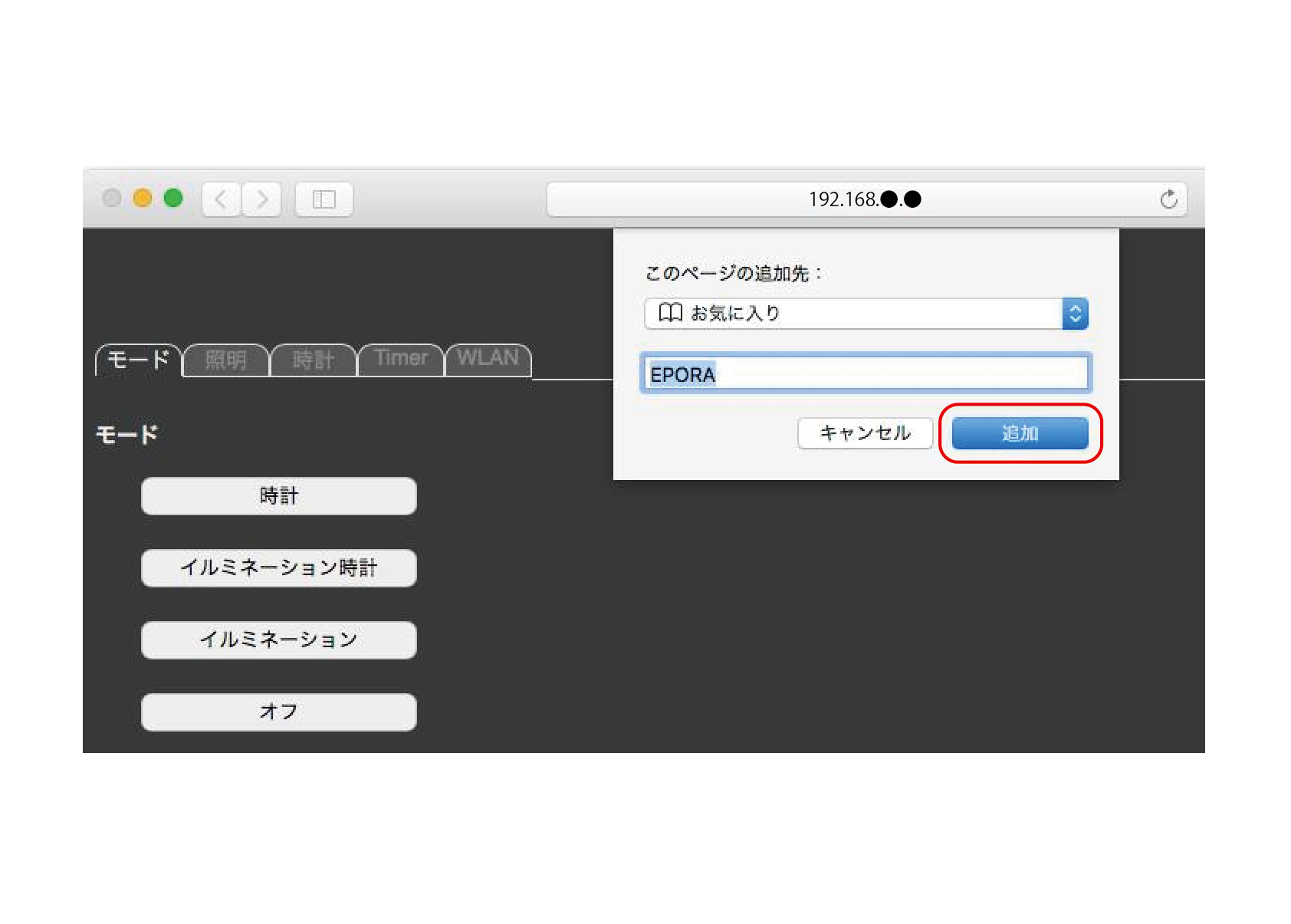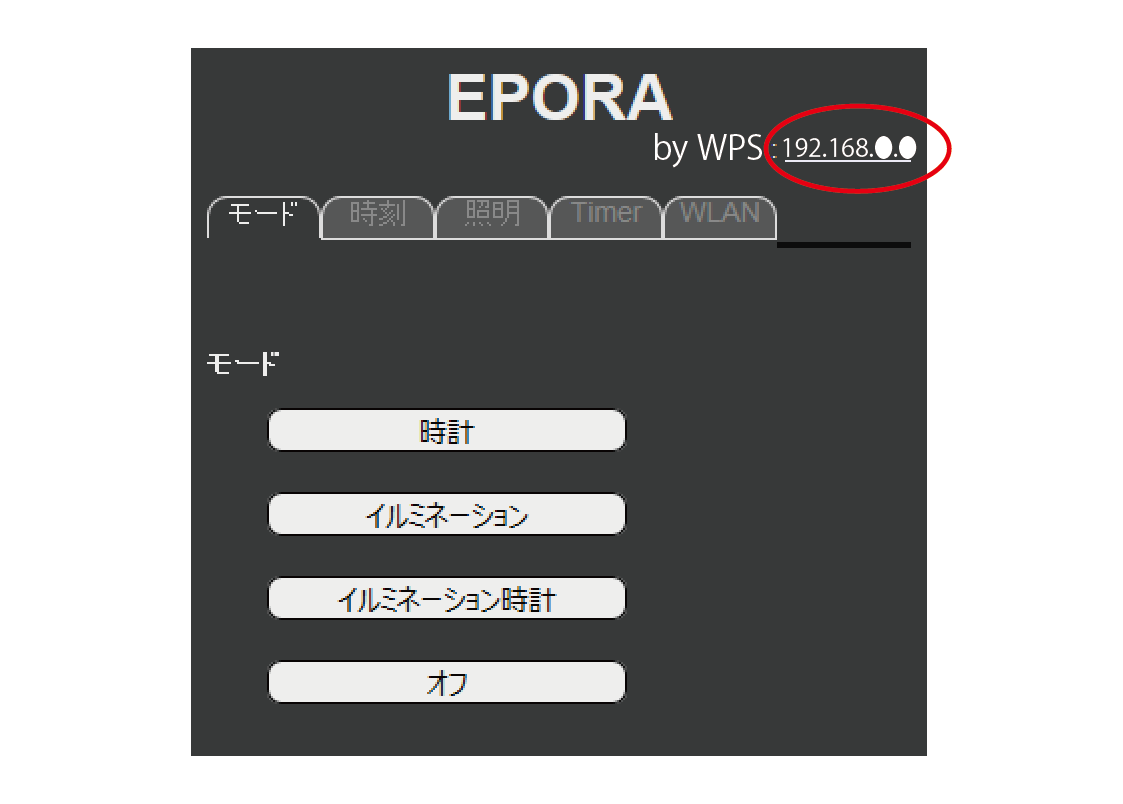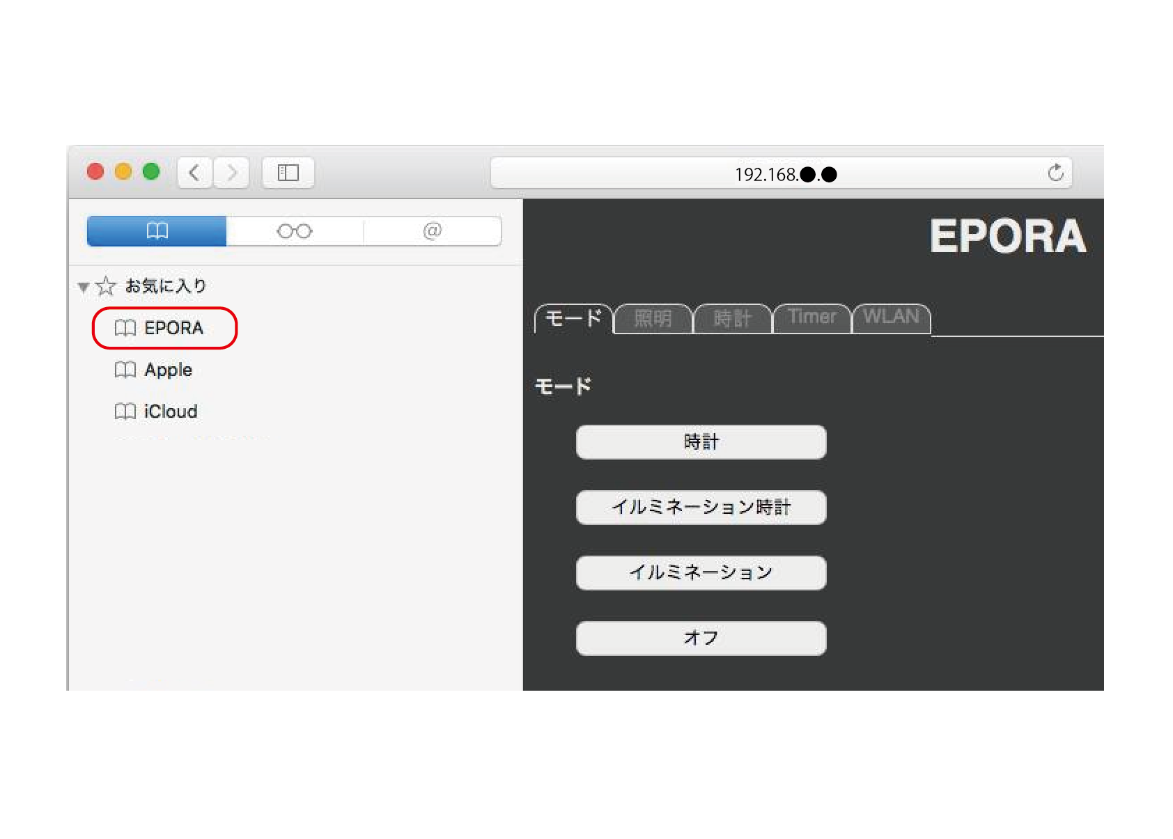 iPhoneを使っての操作です。WiFi設定でEPORAを選択し、ブラウザのアドレスバーに「192.168.4.1」と入力します。Android端末でも基本的な操作は同じです。